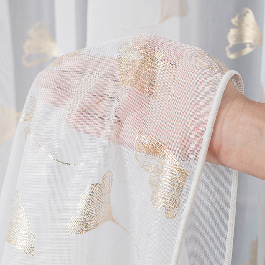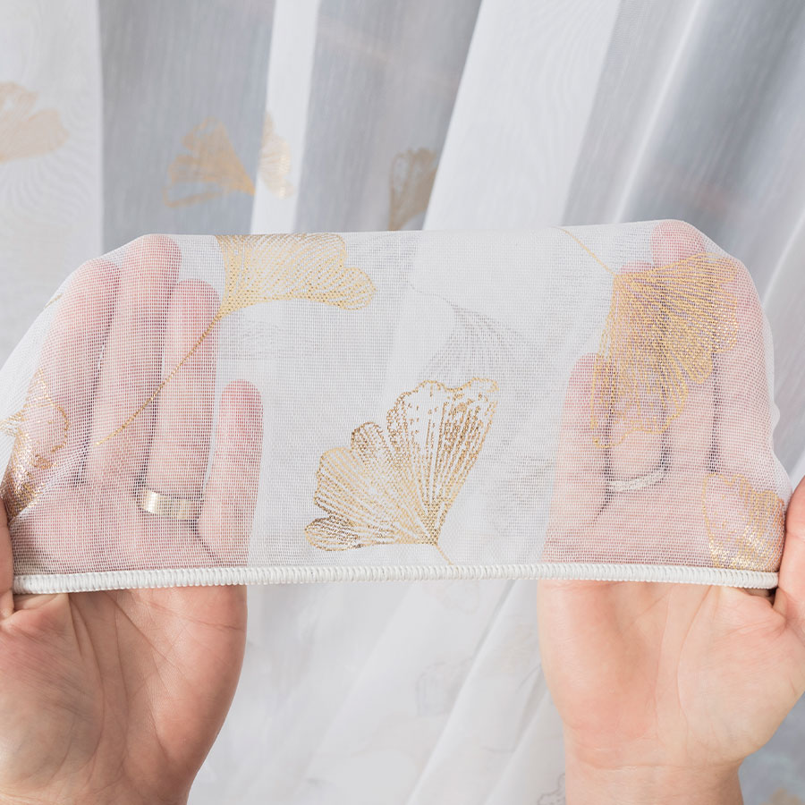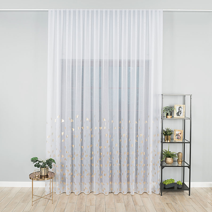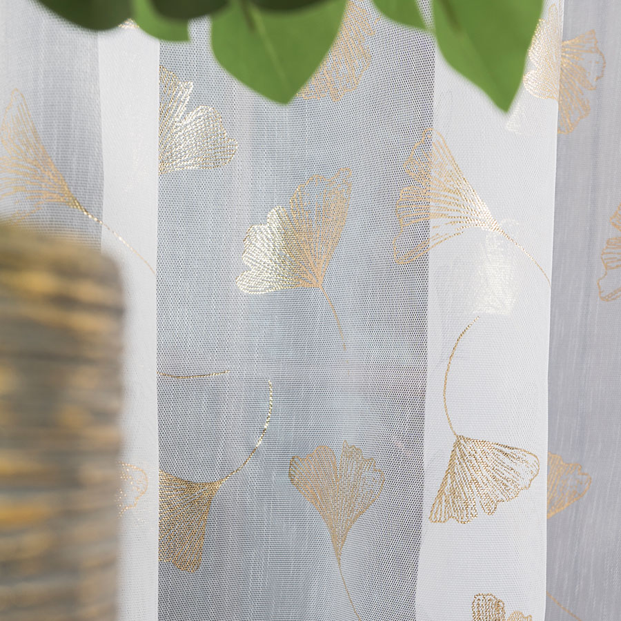 Nowoczesna tkanina dekoracyjna gładka, ozdobiona nadrukowanym wzorem w złote świecące liście. Można wieszać na wilgotno po praniu. Firana uszyta na taśmie marszczącej 1:2, po zmarszczeniu firana będzie mniejsza o połowę. Firana skracana za dodatkową opłatą 15pln. Firana dołem wykończona ołowianką. Góra wszyta taśma marszcząca do wieszania na żabki Agrafki lub haczyki ( za dopłatą taśma na tunel ). Boki obszyte, gotowa do zawieszenie.