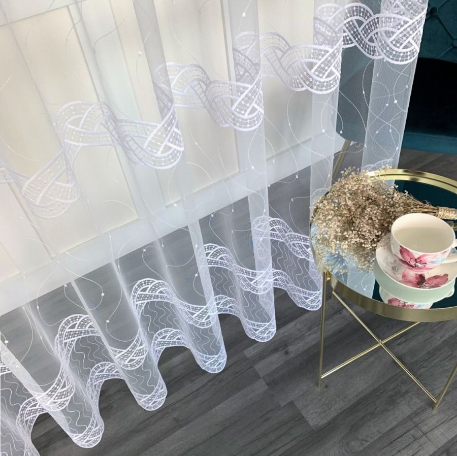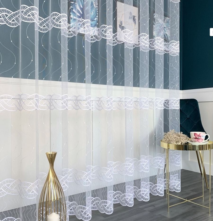 Firana Haftowana Białą Nicią. Dekoracja okienna uszyta na taśmie marszczącej, gotowa do zawieszenia uszyta. Firana z markizety tiulu bardzo dobrej jakościowo. Łatwa w utrzymaniu. Wzory na firanie haftowane białą nicią. Prać w pralce do 40 C w worku do prania firan. Nie wymaga prasowania po praniu można wieszać na wilgotno. Skracanie Firan. Opłata za skrócenie tej firany 7 zł za 1 metr szerokości. W trakcie zamawiania proszę kliknąć pole „Serwis” i wybrać „skracanie Firany” Proszę w czasie zamówienia wpisać w polu komentarz na ile ma zostać skrócona