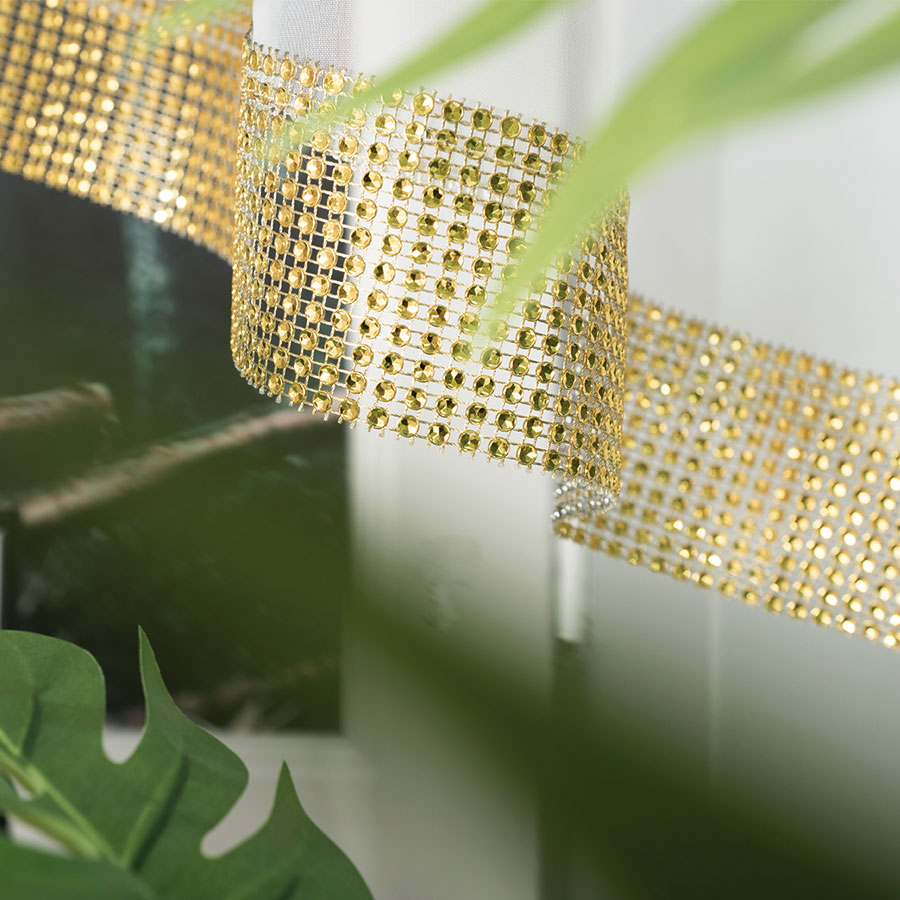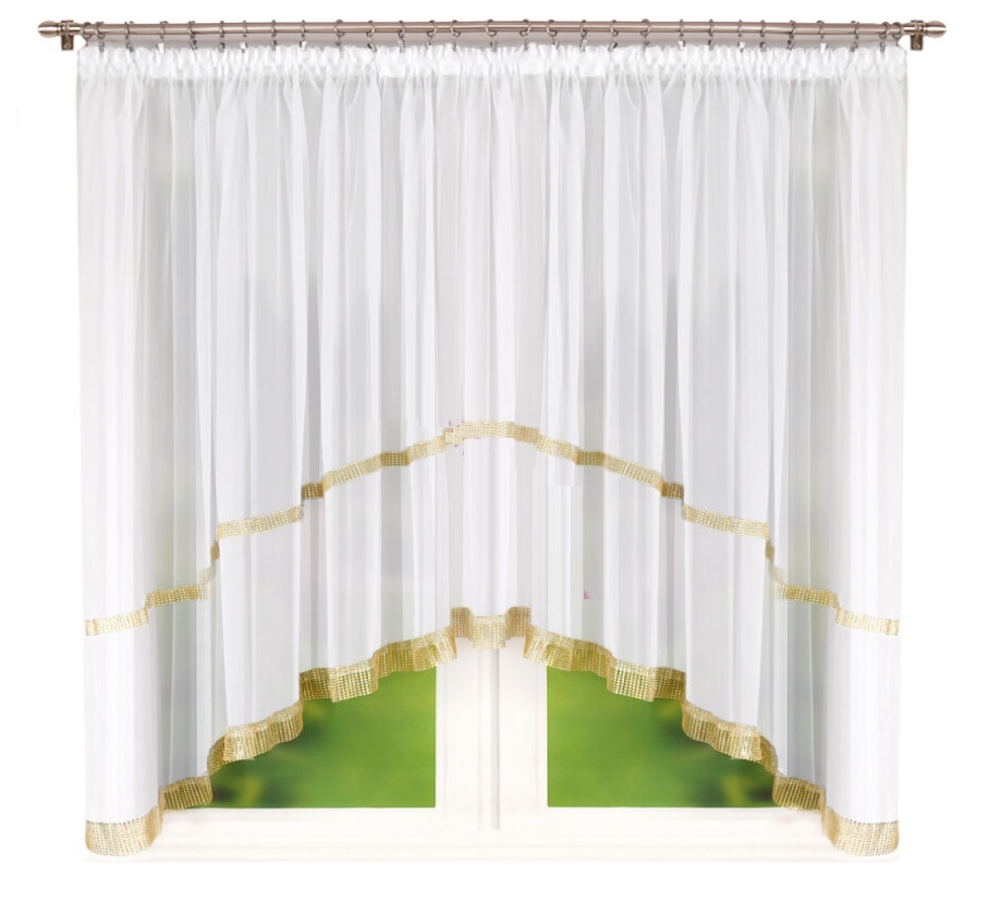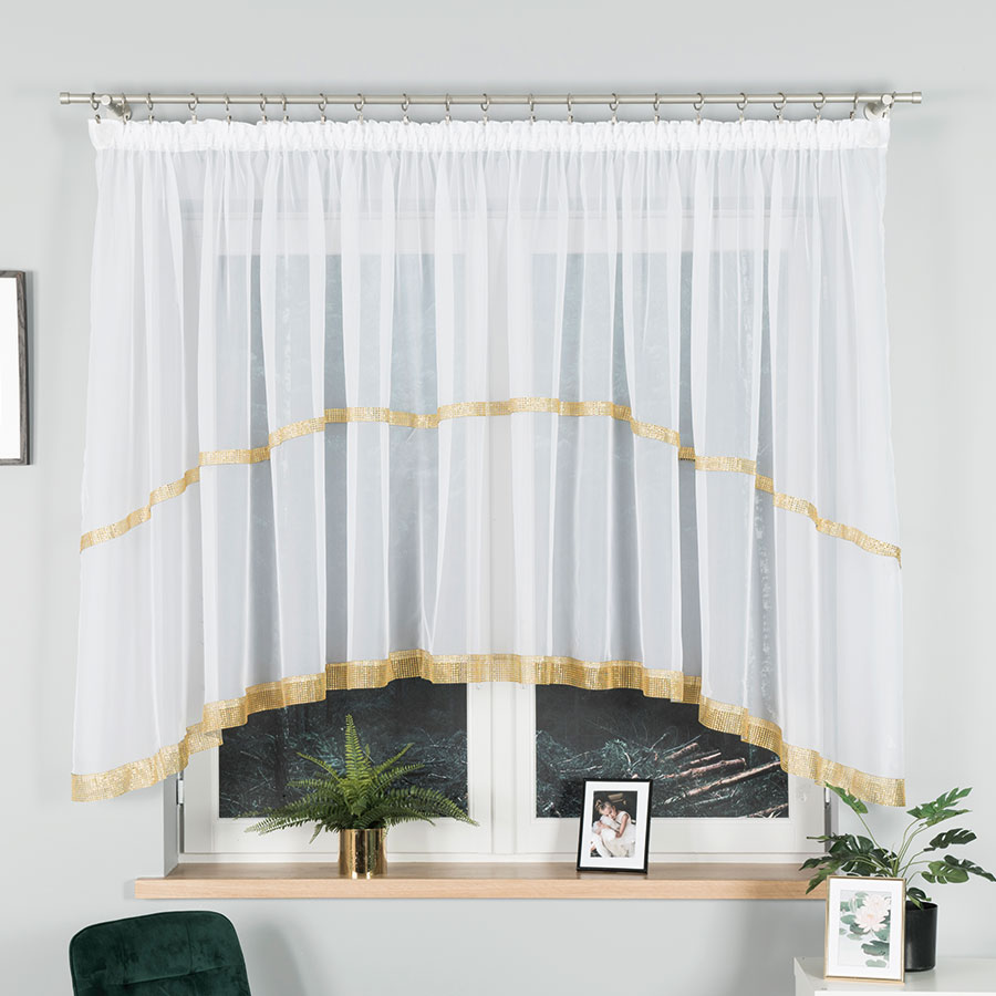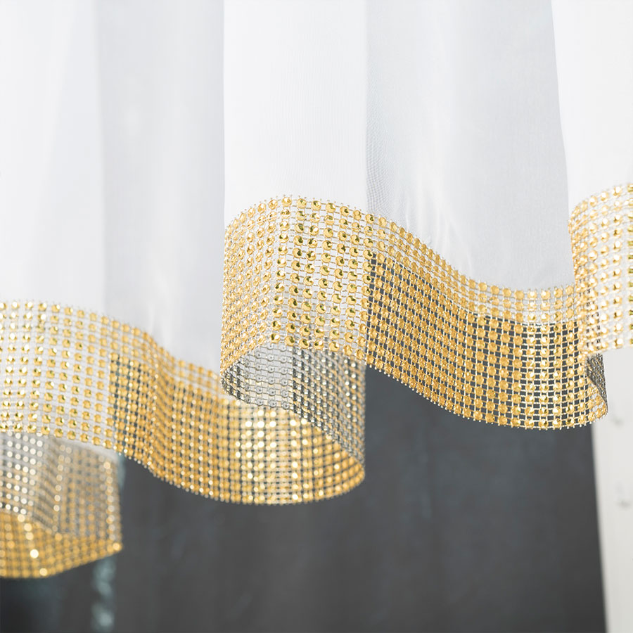 masz pytania?Elegancka białą firana z połyskiem. Wykończona u dołu ozdobną taśmą (o szerokości 6 cm) imitującą pięknie połyskujące kryształki w złotym kolorze. Firana została uszyta na uniwersalnej taśmie marszczącej, która umożliwia montaż na karniszu rurkowym lub na żabkach i haczykach. Taśma pozwala zmarszczyć tkaninę na dowolną szerokość i dopasować firanę do szerokości karnisza. Boki firany obszyte są białą lamówką.