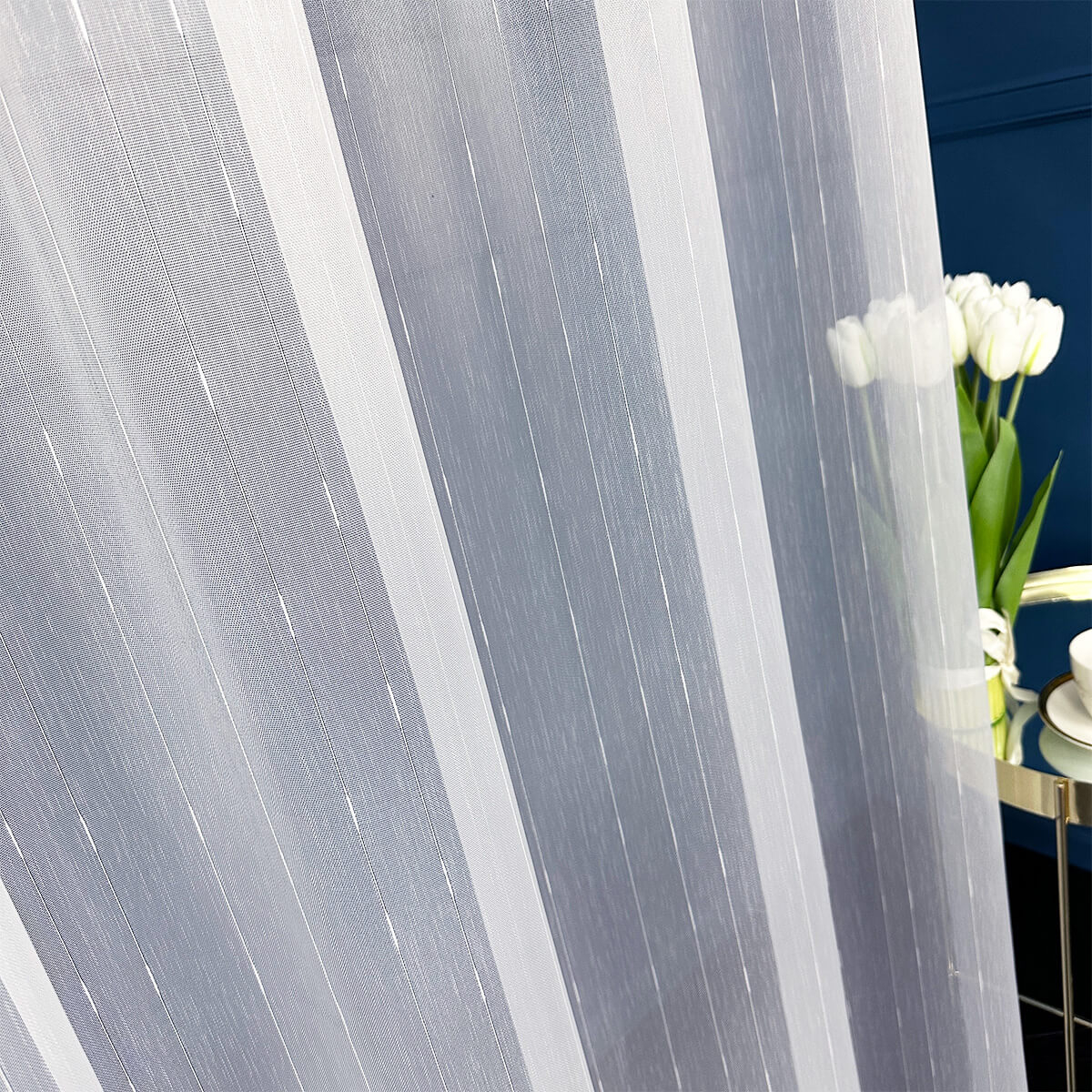 Nowoczesna tkanina dekoracyjna. Tkanina nie wymaga prasowania jest gładka. Maksymalna wysokość tej firany to 300 cm. Firana jest skracana za dodatkową opłatą 19,99 PLN. Firana uszyta na taśmie marszczącej 1:2, po zmarszczeniu firana będzie mniejsza o połowę.