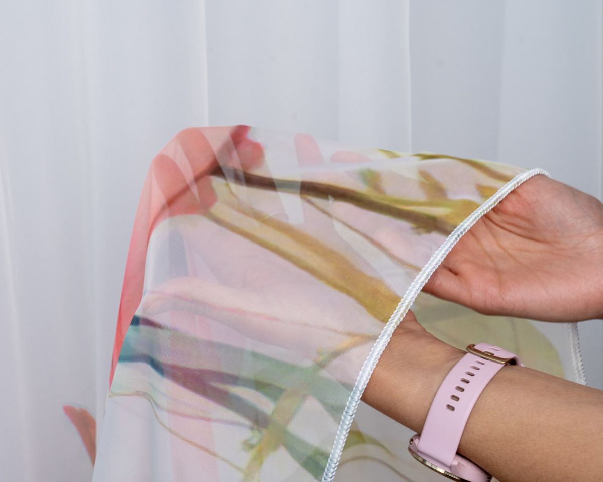Kwiaty pięknie drukowane na firanie, boki obszyte, górą taśma marszcząca. Możemy za dodatkową opłatą 15 PLN skrócić firanę. Podana cena za jedną sztukę firany. Rozmiar podany przed zmarszczeniem.
