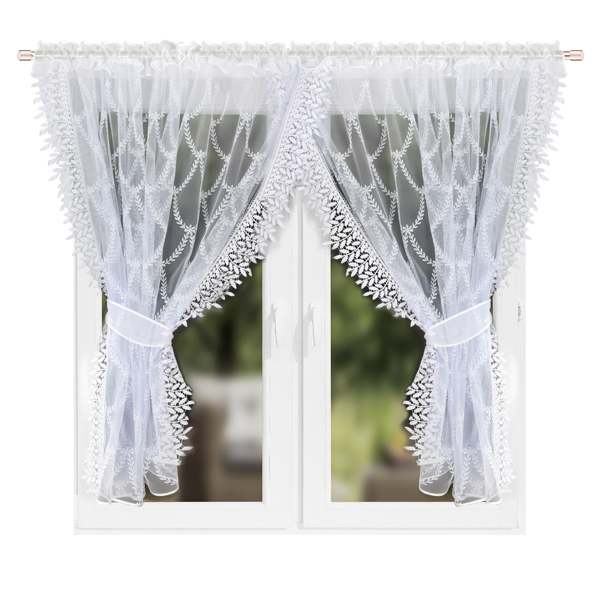 Zdjęcie firany poglądowe, z uwagi na dostępność dodatków gipiura wszywana do firany może różnić się wzorem od prezentowanej na zdjęciu, o aktualny wzór wszywanej gipiury można dopytać e-mailowo.