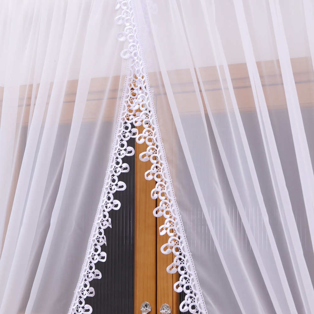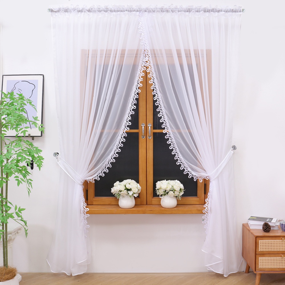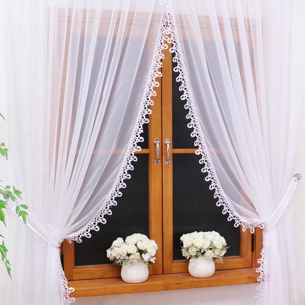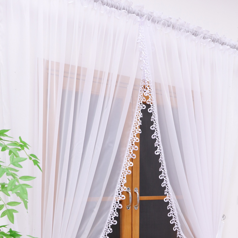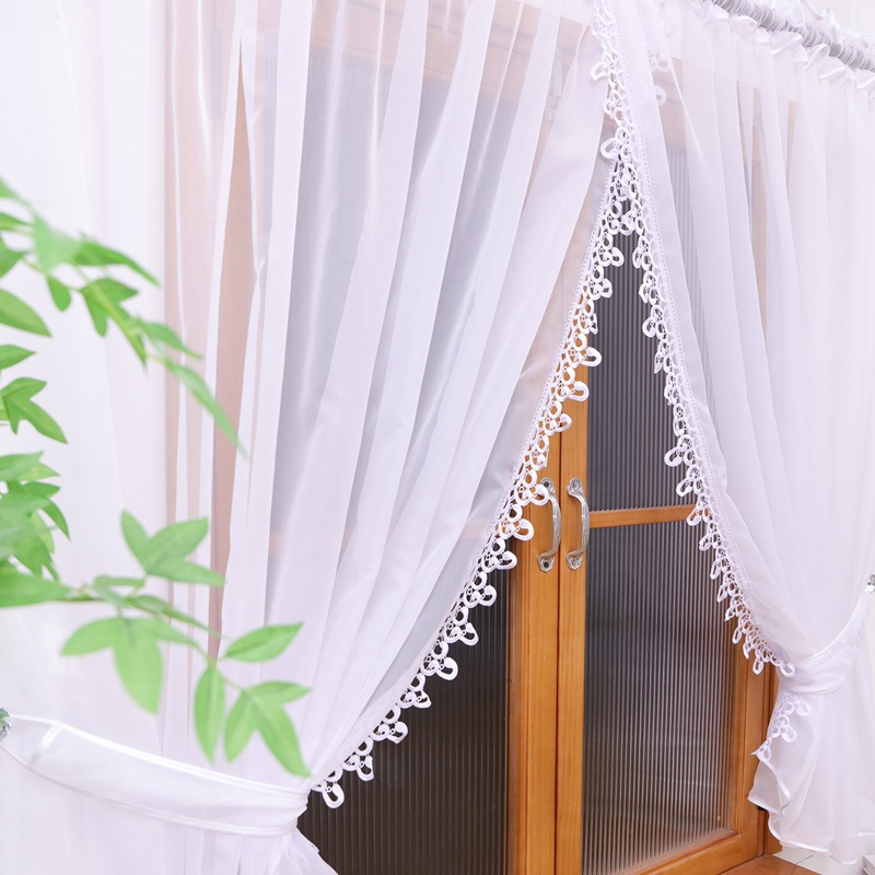 Delikatna biała firana została uszyta z gładkiego woalu. Miłą w dotyku strukturą materiału przepuszcza światło i chroni prywatność mieszkańców. Brzegi firanki wykończone są piękną gipiurą. Do kompletu dołączono dwie ażurowe podwiązki do podpięcia firan.
