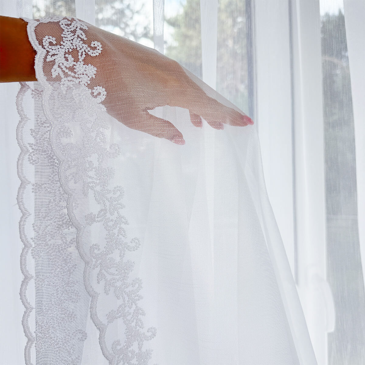 Firana Haftowana Białą Nicią. Dekoracja okienna uszyta na taśmie marszczącej, gotowa do zawieszenia uszyta. Firana z markizety bardzo dobrej jakościowo. Łatwa w utrzymaniu. Wzory na firanie haftowane białą nicią, dające przepiękny efekt. Możliwe na zamówienie uszycie innych wymiarów. Prać w pralce do 40 C w worku do prania firan. Nie wymaga prasowania po praniu można wieszać na wilgotno. Skracanie Firan. Opłata za skrócenie tej firany 7 zł za 1 metr szerokości. W trakcie zamawiania proszę kliknąć pole „Serwis” i wybrać „skracanie Firany” Proszę w czasie zamówienia wpisać w polu komentarz na ile ma zostać skrócona