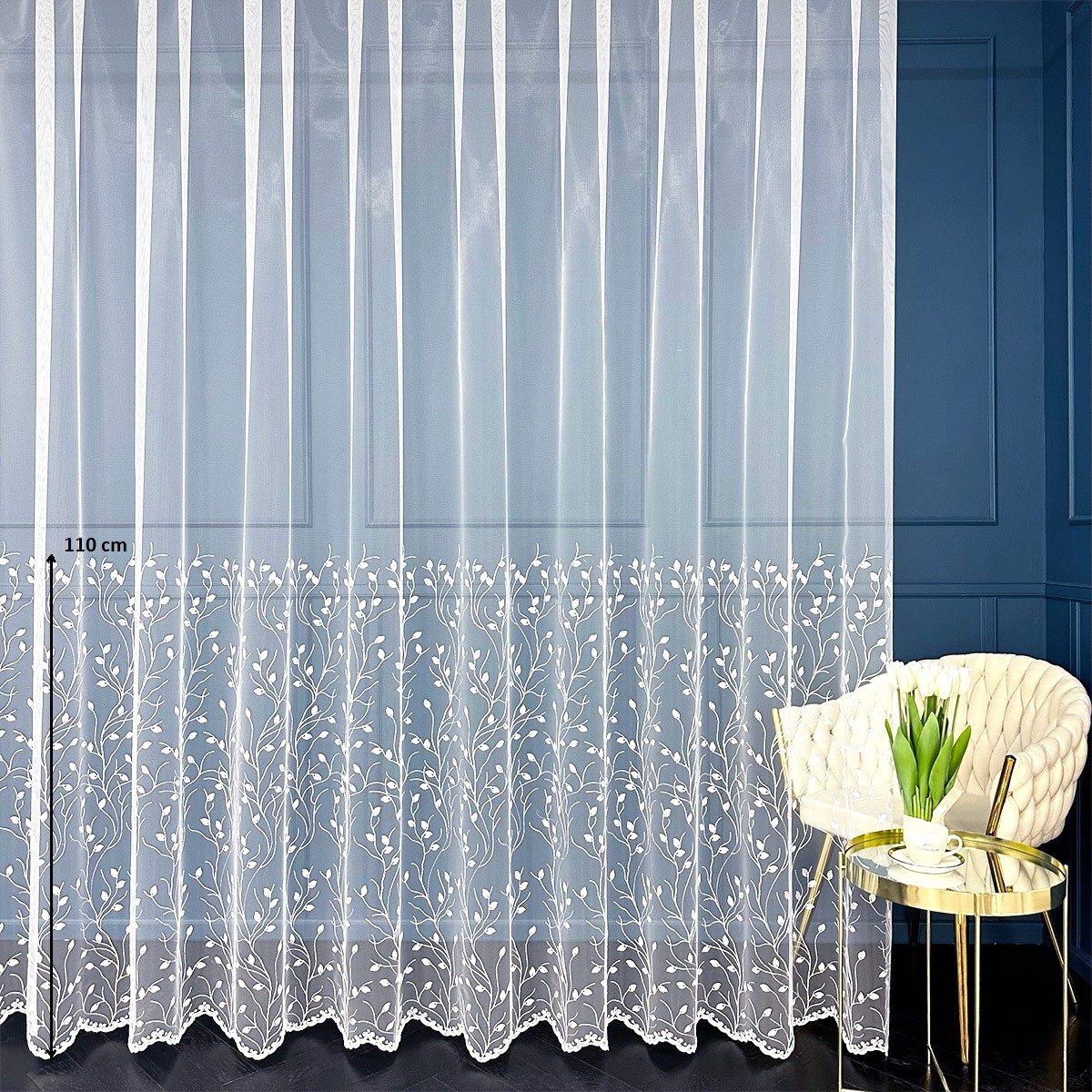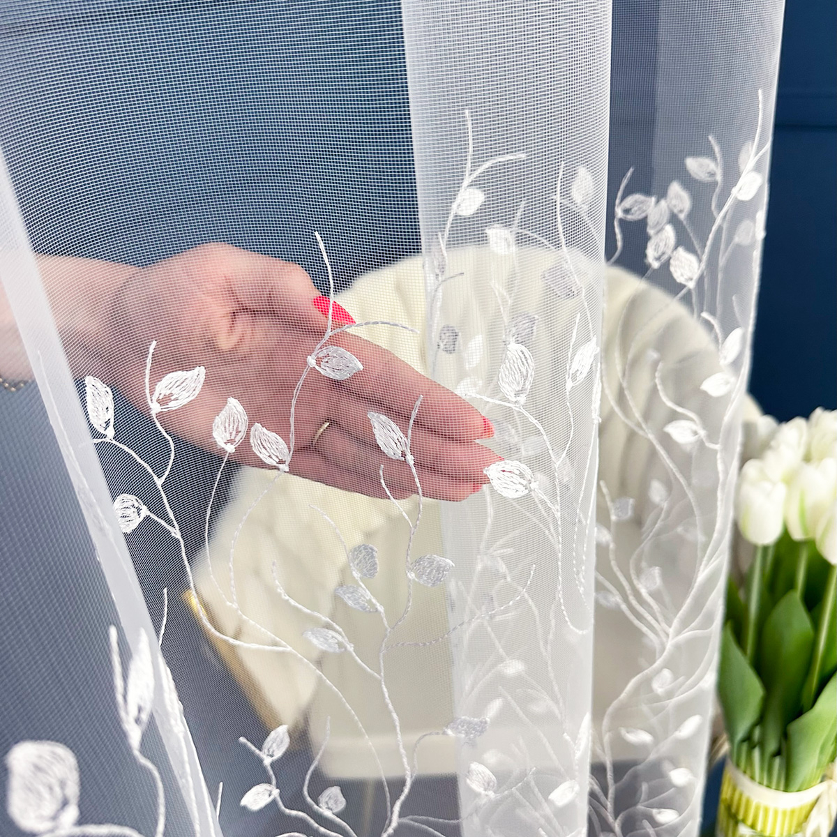 Firana haftowana białą nicią stanowi efektowną aranżację okna . Dekoracja okienna uszyta na taśmie marszczącej, gotowa do zawieszenia uszyta. Firana z markizety bardzo dobrej jakościowo. Łatwa w utrzymaniu. Możliwe na zamówienie uszycie innych wymiarów. Prać w pralce do 40 C w worku do prania firan. Nie wymaga prasowania po praniu można wieszać na wilgotno.Firana prezentuje się najlepiej namarszczona w zakresie 1:2. Skracanie Firan. Opłata za skrócenie tej firany 7 zł za 1 metr szerokości. W trakcie zamawiania proszę kliknąć pole „Serwis” i wybrać „skracanie Firany” Proszę w czasie zamówienia wpisać w polu komentarz na ile ma zostać skrócona