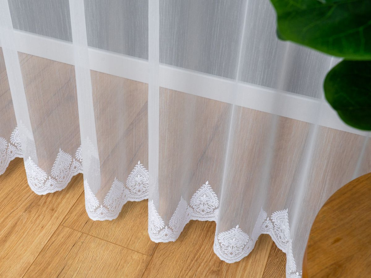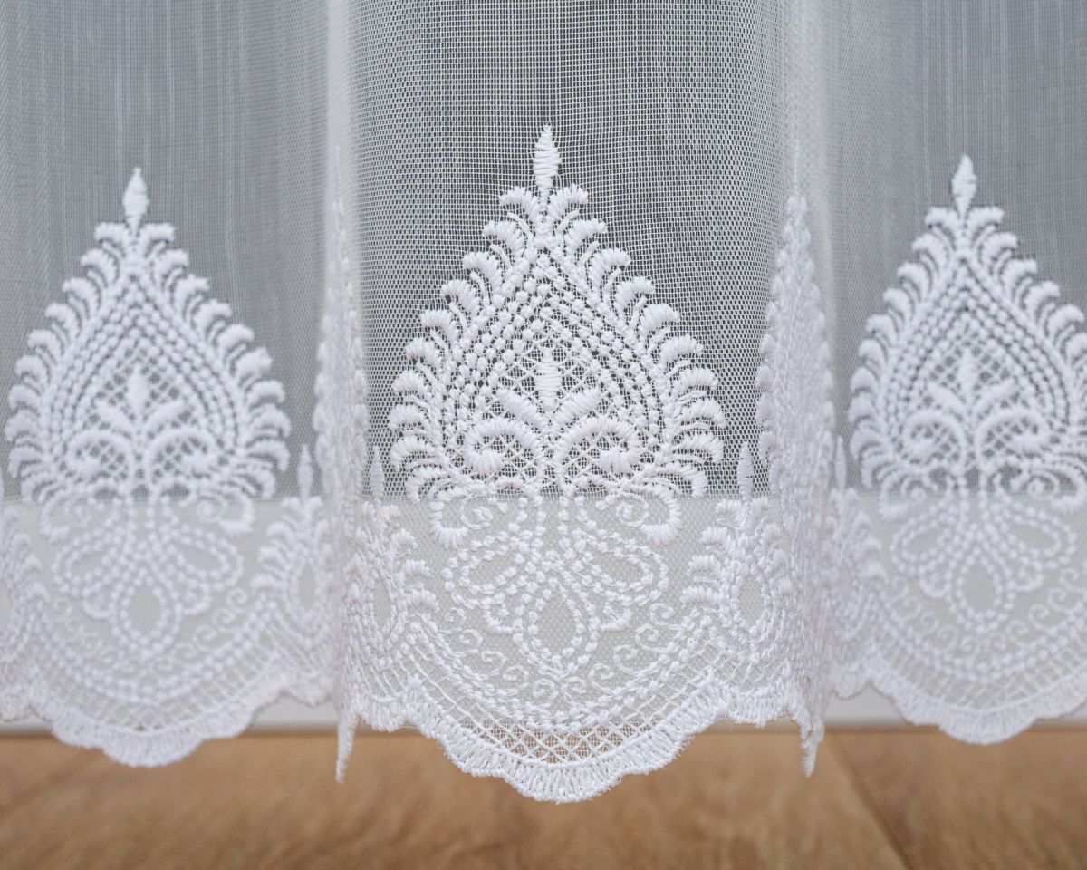 Firana Haftowana uszyta na taśmie marszczącej, gotowa do zawieszenia. Firana z markizety bardzo dobrej jakościowo. Łatwa w utrzymaniu. Wzory na firanie haftowane białą nicią, dające przepiękny mieniący się efekt. Możliwe na zamówienie uszycie innych wymiarów. Prać w pralce do 40 C w worku do prania firan. Nie wymaga prasowania po praniu można wieszać na wilgotno. Skracanie Firan. Opłata za skrócenie tej firany 7 zł za 1 metr szerokości. W trakcie zamawiania proszę kliknąć pole „Serwis” i wybrać „skracanie Firany” Proszę w czasie zamówienia wpisać w polu komentarz na ile ma zostać skrócona.