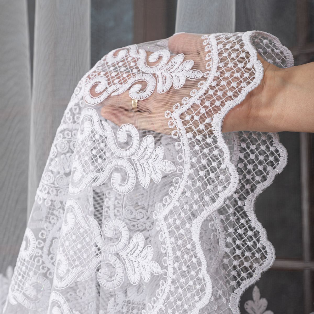 Firana Haftowana Białą Nicią z Połyskiem. Dekoracja okienna uszyta na taśmie marszczącej, gotowa do zawieszenia uszyta. Firana z markizety bardzo dobrej jakościowo. Łatwa w utrzymaniu. Wzory na firanie haftowane białą lekko nabłyszczoną nicią, dające przepiękny mieniący się efekt. Możliwe na zamówienie uszycie innych wymiarów. Prać w pralce do 40 C w worku do prania firan. Nie wymaga prasowania po praniu można wieszać na wilgotno. Skracanie Firan. Opłata za skrócenie tej firany 7 zł za 1 metr szerokości. W trakcie zamawiania proszę kliknąć pole „Serwis” i wybrać „skracanie Firany” Proszę w czasie zamówienia wpisać w polu komentarz na ile ma zostać skrócona
