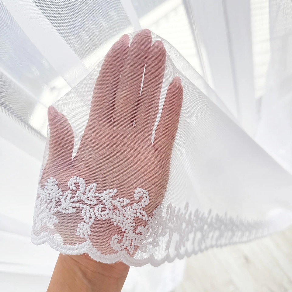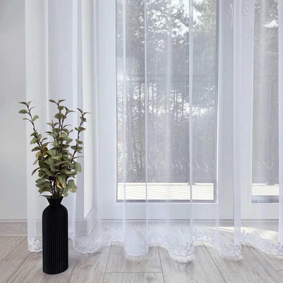 Firana Haftowana Białą Nicią. Dekoracja okienna uszyta na taśmie marszczącej, gotowa do zawieszenia uszyta. Firana z markizety bardzo dobrej jakościowo. Łatwa w utrzymaniu. Wzory na firanie haftowane białą nicią, dające przepiękny efekt. Możliwe na zamówienie uszycie innych wymiarów. Prać w pralce do 40 C w worku do prania firan. Nie wymaga prasowania po praniu można wieszać na wilgotno. Skracanie Firan. Opłata za skrócenie tej firany 7 zł za 1 metr szerokości. W trakcie zamawiania proszę kliknąć pole „Serwis” i wybrać „skracanie Firany” Proszę w czasie zamówienia wpisać w polu komentarz na ile ma zostać skrócona